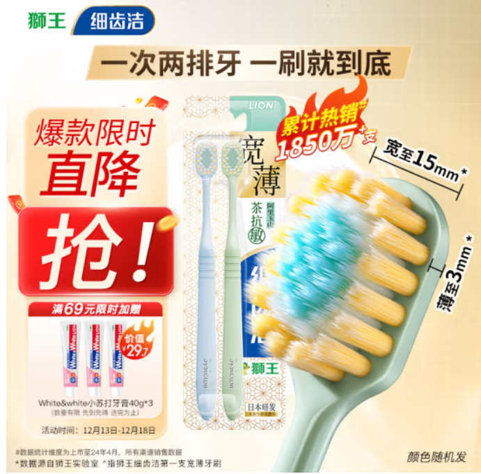 商品名称:狮王细齿洁宽薄茶抗敏牙刷两支装